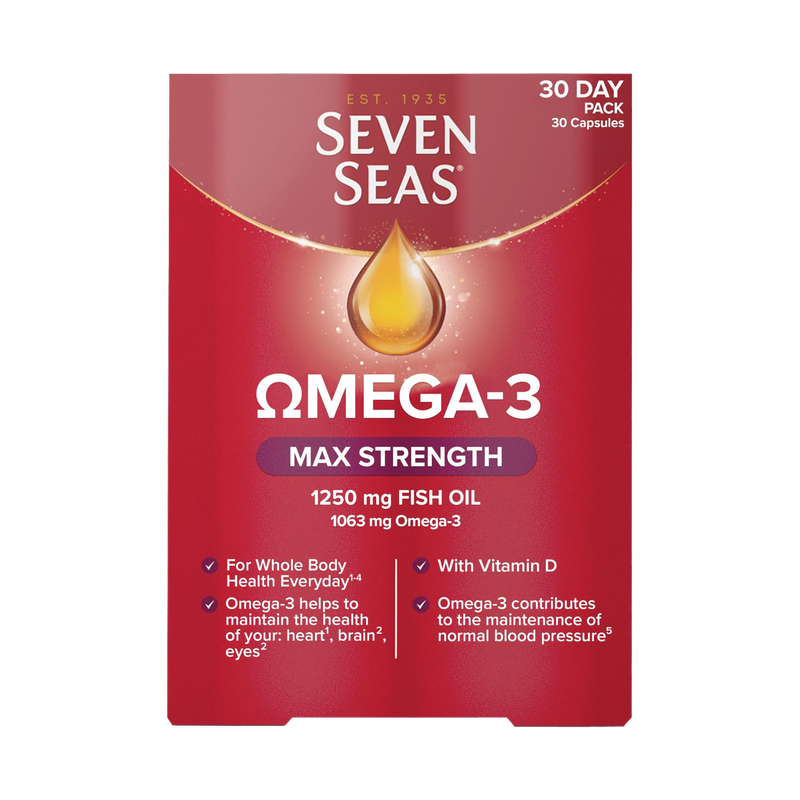 • Seven Seas Omega-3 Max Strength With Vitamin D is carefully formulated to support your heart, brain, and vision health. Each capsule provides a potent dose of essential omega-3 fatty acids and Vitamin D, ensuring your body receives the nutrients it needs to thrive. With a remarkable increase in Omega-3 concentration, this supplement delivers an impressive 1063 mg of Omega-3 from a 1250 mg fish oil dosage.