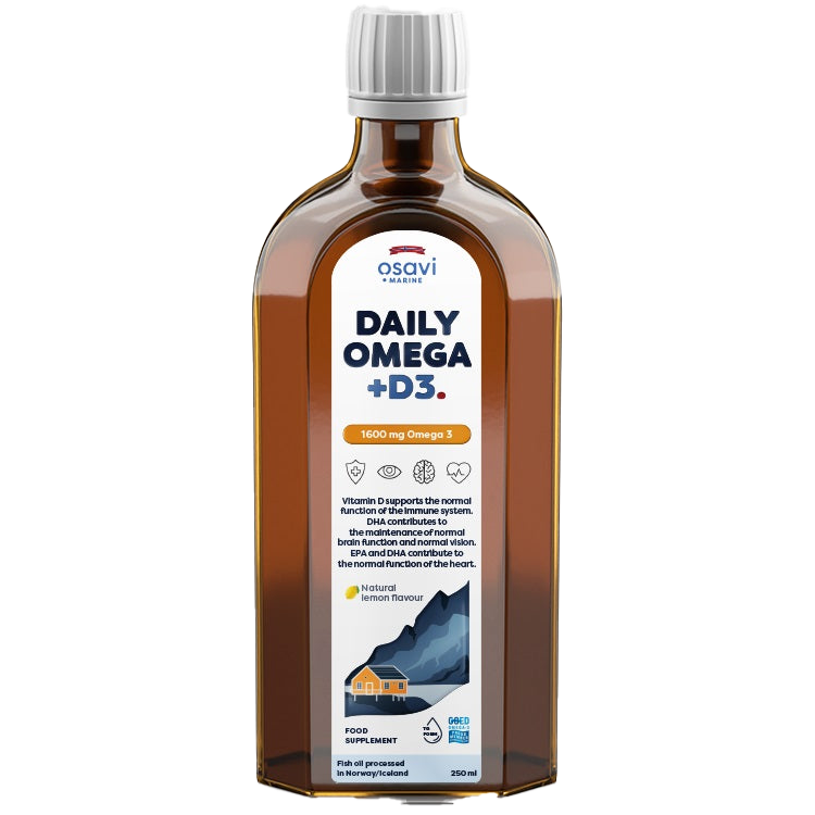 Osavi Daily Omega + D3 is a premium liquid food supplement designed to enhance your overall health. Formulated from wild pelagic fishes, primarily anchovies, this product is crafted using sustainable fishing practices, ensuring that you not only care for your health but also for the environment.