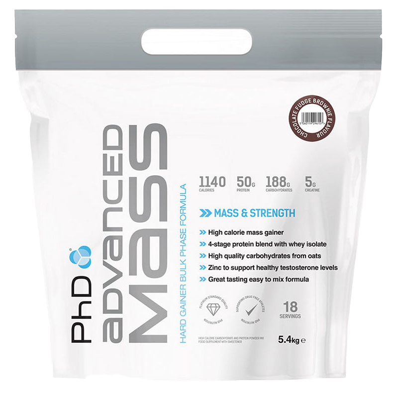 PhDAdvanced Mass, Chocolate Fudge Brownie - 5400gFood supplement providing a convenient and effective way to support muscle growth and weight gain, with a high-quality formula in every serving.Nutrition FactsServing Size: 3 Scoops (300g)Servings Per Container: 18