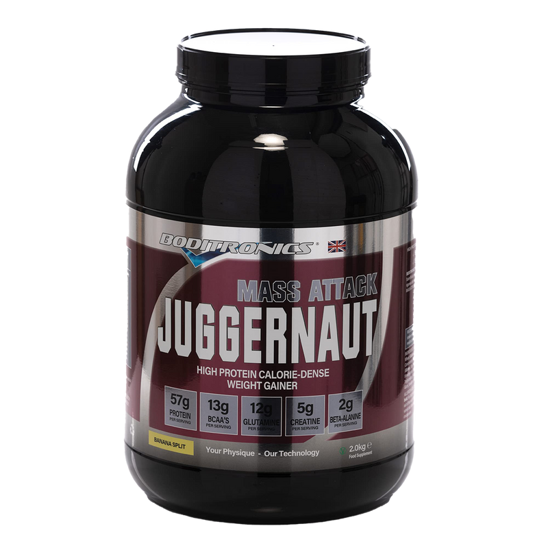 Mix two heaped scoops (150g) in 350ml of water in a shaker or blender, shake vigorously for 20 seconds and consume. For best results, consume 2 servings per day. Safety Warning: Please note dietary supplements are not intended to diagnose, treat, cure or prevent any disease. It is always recommendable that you speak with a medical practitioner prior to taking any form of dietary supplementation, particularly if you have any current health concerns. Dietary supplements are intended to support an otherwise healthy lifestyle, and should not be a substitute for such. Please closely adhere to product guidelines and instructions for use. For any known allergens, please carefully consult the nutritional information provided and the list of ingredients. Box Contains: 1 x Mass Attack Juggernaut Powder, Banana Split.