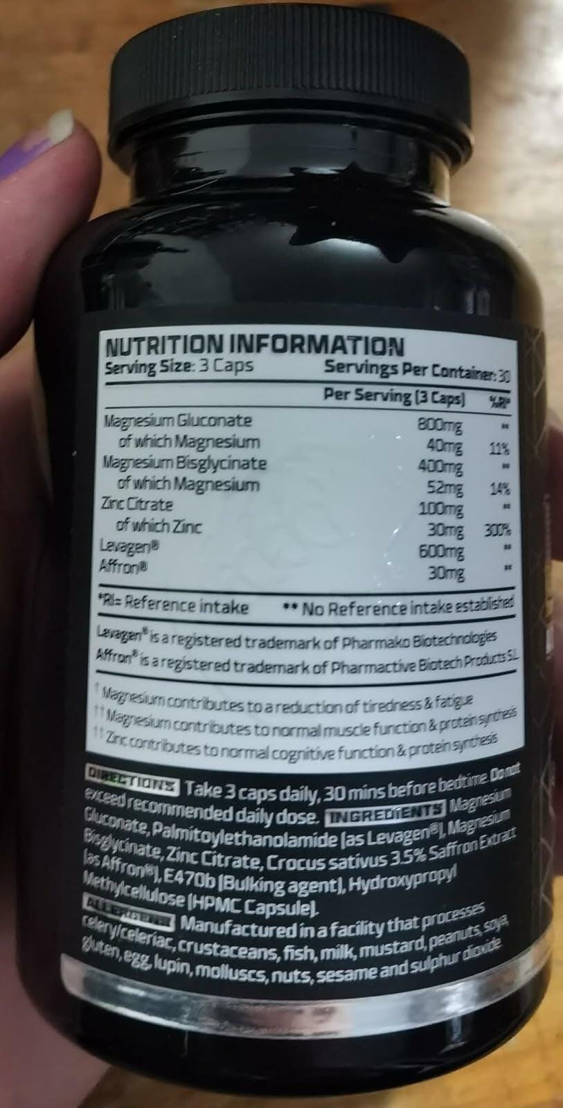 Magnesium Gluconate, Palmitoylethanolamide (as LevagenĀ®), Magnesium Bisglycinate, Zinc Citrate, Crocus sativus 3.5% Saffron extract (as AfronĀ®), E470b (Bulking agent), Hydroxypropyl Methylcellulose (HPMC Capsule)